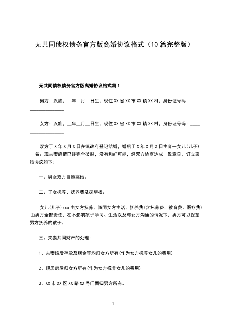无共同债务官方版离婚协议范文篇10