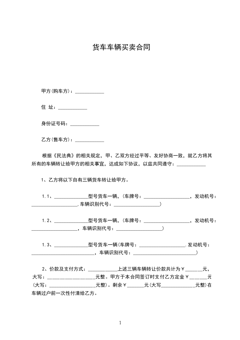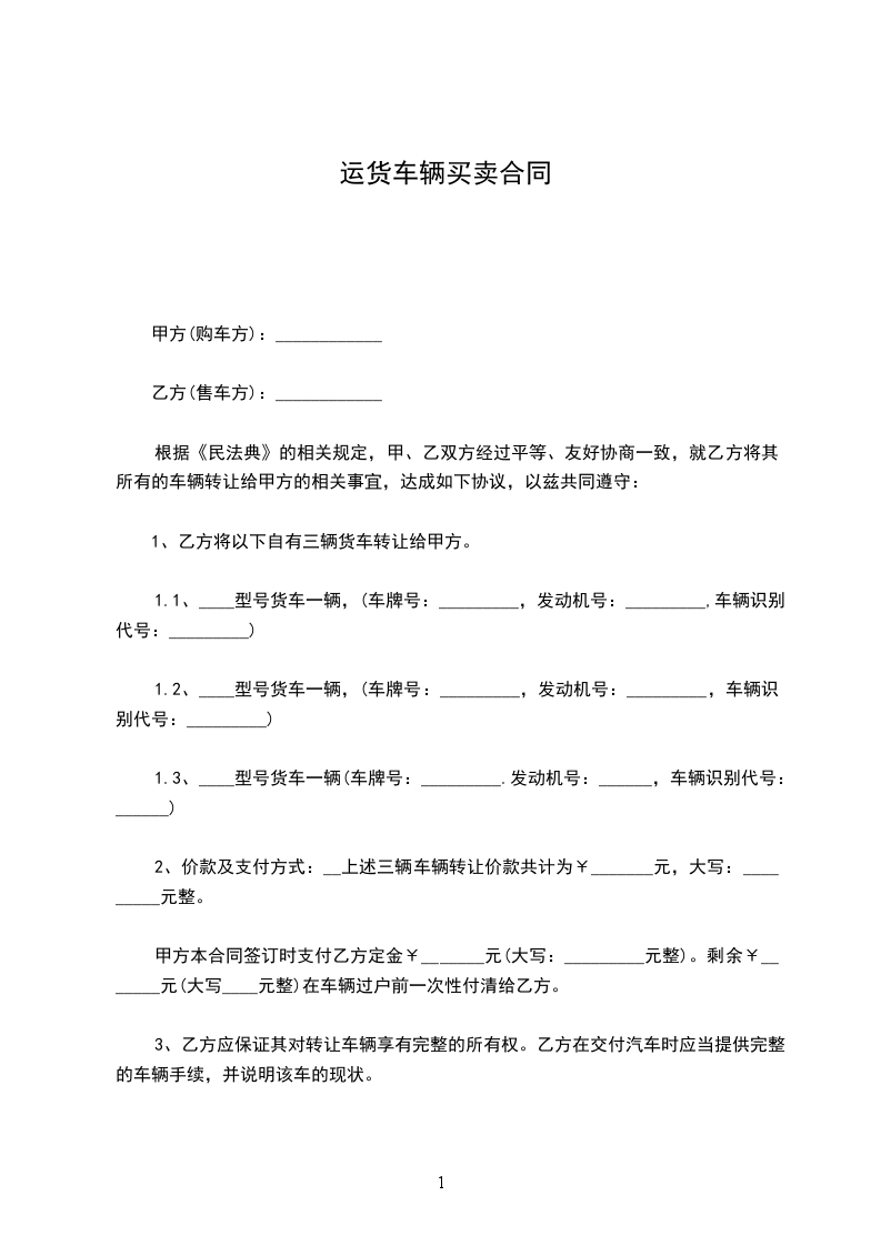 1、乙方将以下自有三辆货车转让给甲方。