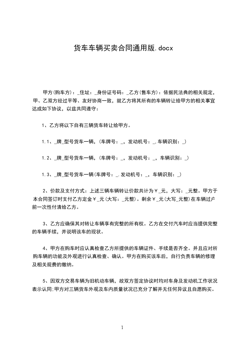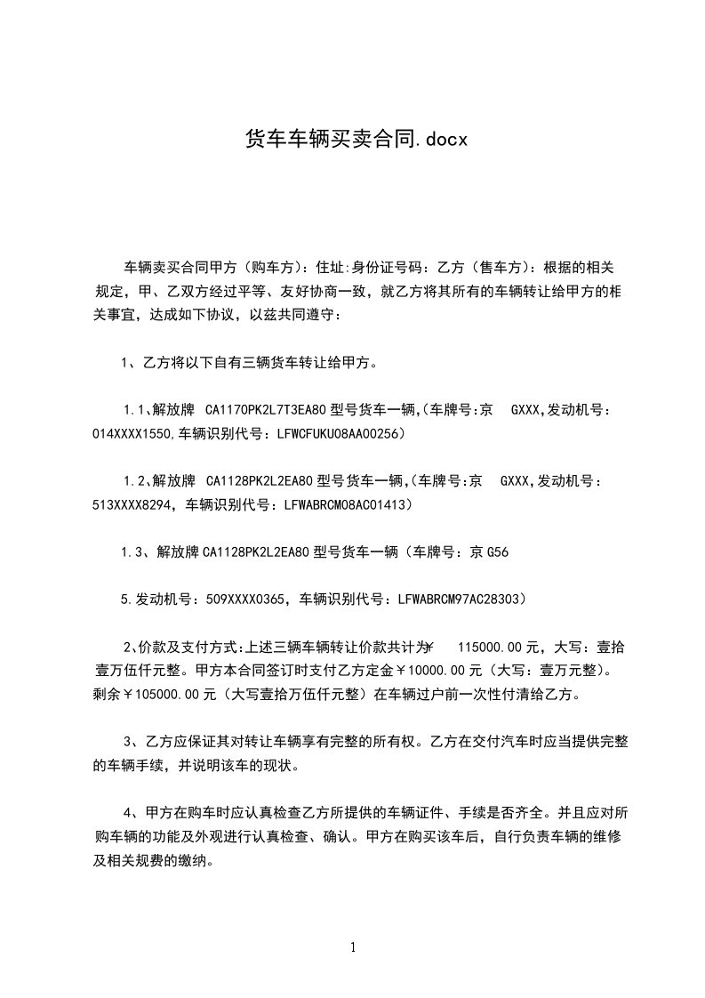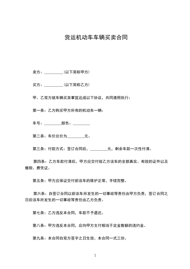 1.3、______________型号货车一辆(车牌号:___________________.发动机号:__________________________,车辆识别代号:__________________________)