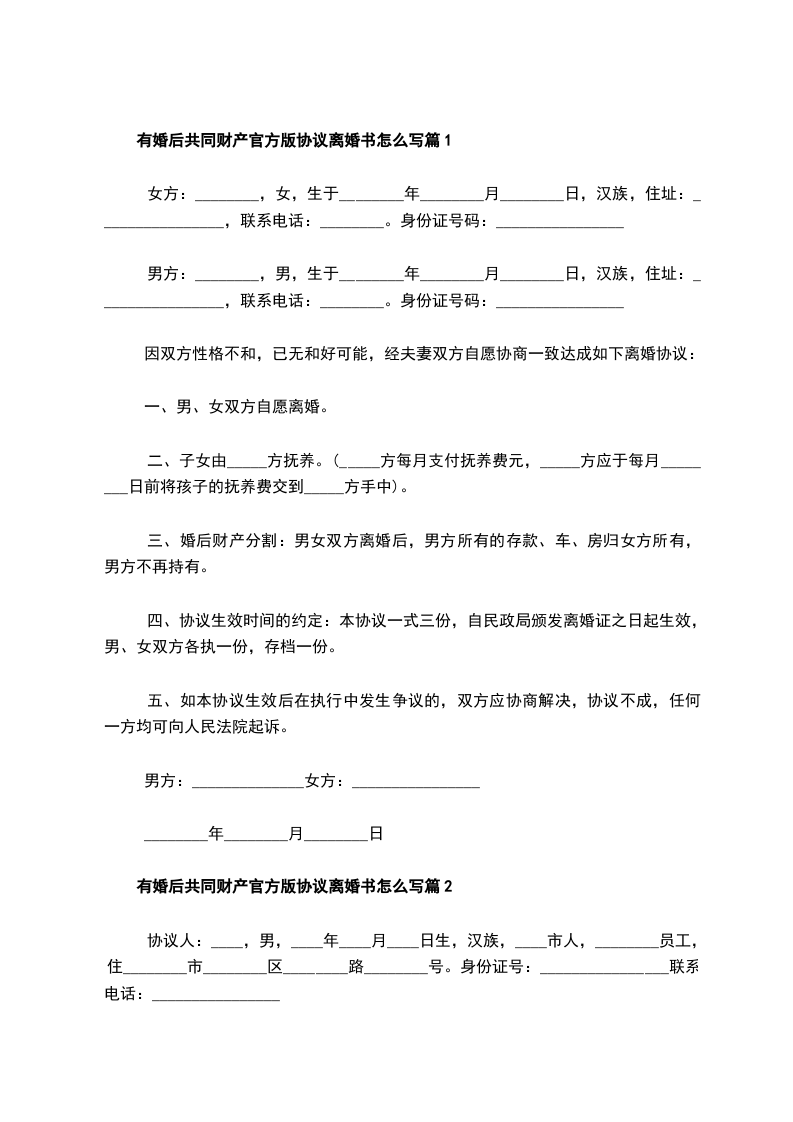 有婚后共同财产官方版协议离婚书怎么写篇5