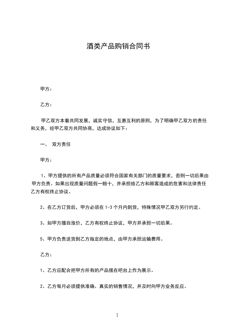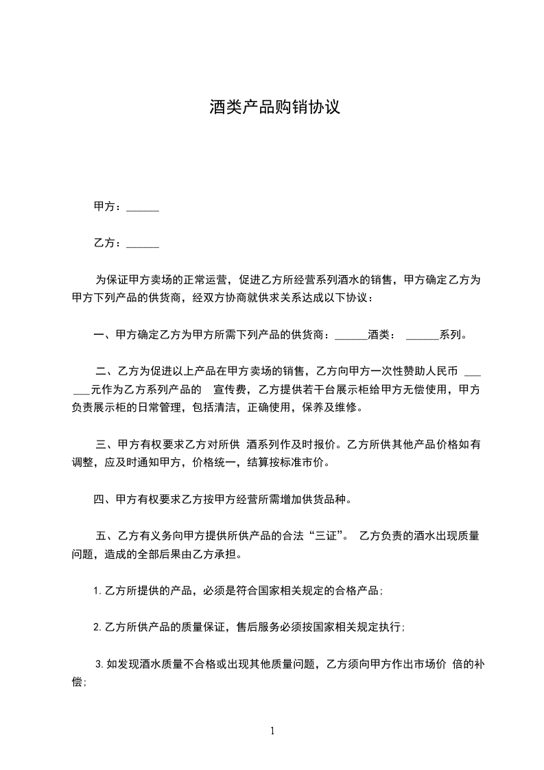 4、乙方购进的产品如果销售不畅,任何品牌的酒水,随时可调换别的产品或原价办理退货。