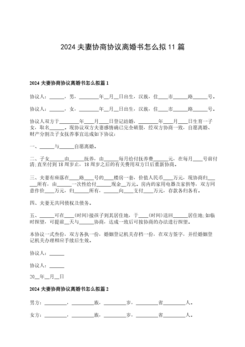 九、本协议一式________份,自婚姻登记处颁发离婚证之日起生效,男、女双方各执________份,婚姻登记机关存档一份。