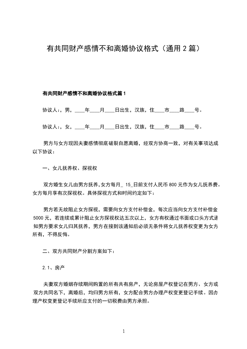 我们双方于_____年_____月_____日办理结婚登记,因婚后感情不和,现夫妻关系已彻底破裂,经反复冷静思考,我们自愿离婚,解除夫妻关系,经男女双方协商,一致达成如下离婚协议: