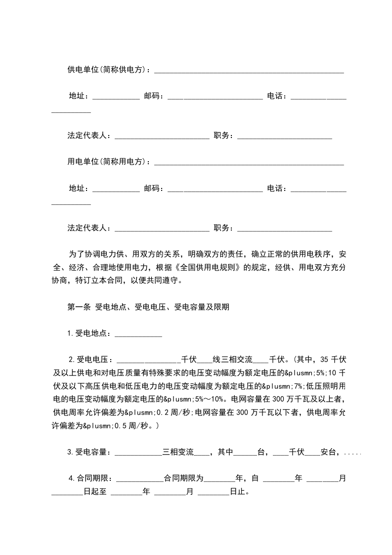 为了协调电力供、用双方的关系,明确双方的责任,确立正常的供用电秩序,安全、经济、合理地使用电力,根据《全国供用电规则》的规定,经供、用电双方充分协商,特订立本合同,以便共同遵守。