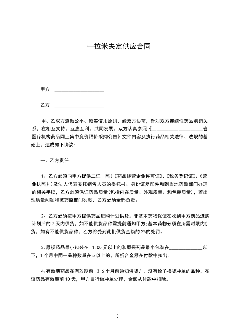 三、供方要对提供的药品质量负责,向需方提供的药品应符合国家药品标准。供方所提供的药品凡因质量问题所造成的如抽检不合格、药害事件等后果,概由供方承担。如因需方储存和保管不当造成的损失由需方自行负责。