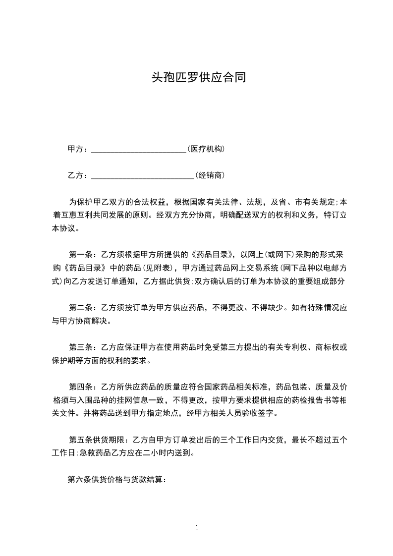 第二条:乙方须按订单为甲方供应药品,不得更改、不得缺少。如有特殊情况应与甲方协商解决。