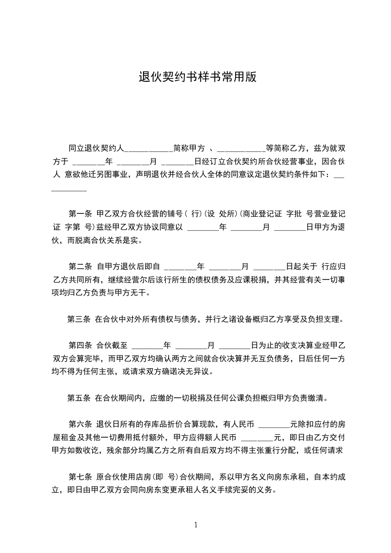 第一条 甲乙双方合伙经营的铺号( 行)(设 处所)(商业登记证 字批 号营业登记证 字第 号)兹经甲乙双方协议同意以 ________年 ________月 ________日甲方为退伙,而脱离合伙关系是实。