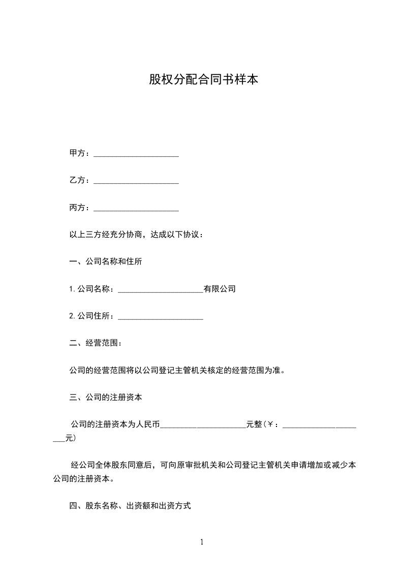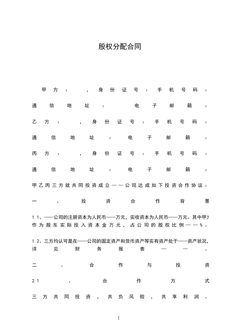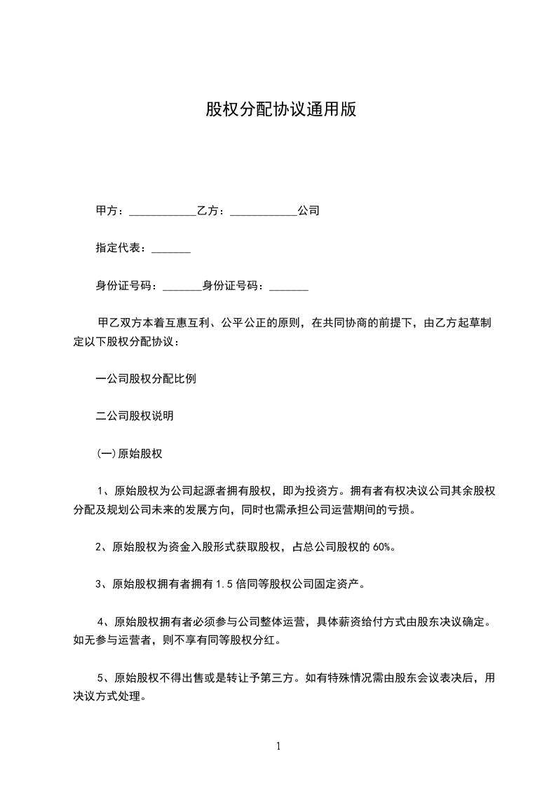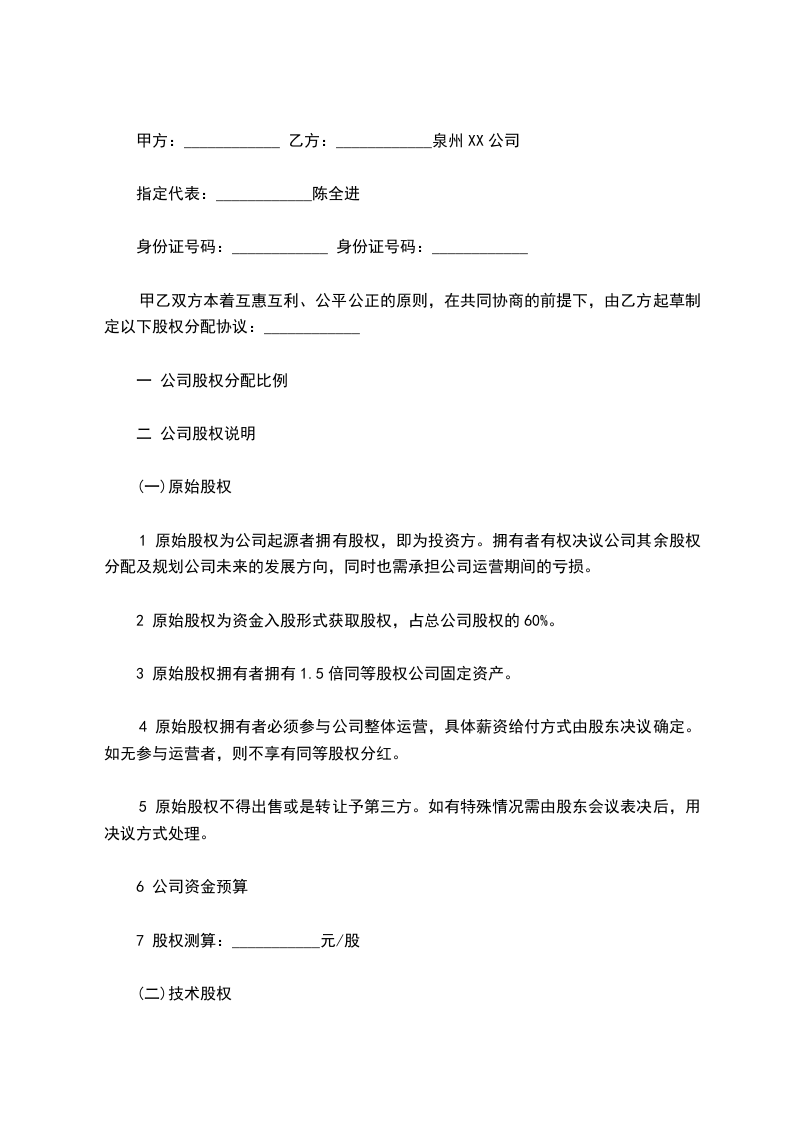 甲乙双方本着互惠互利、公平公正的原则,在共同协商的前提下,由乙方起草制定以下股权分配协议:____________