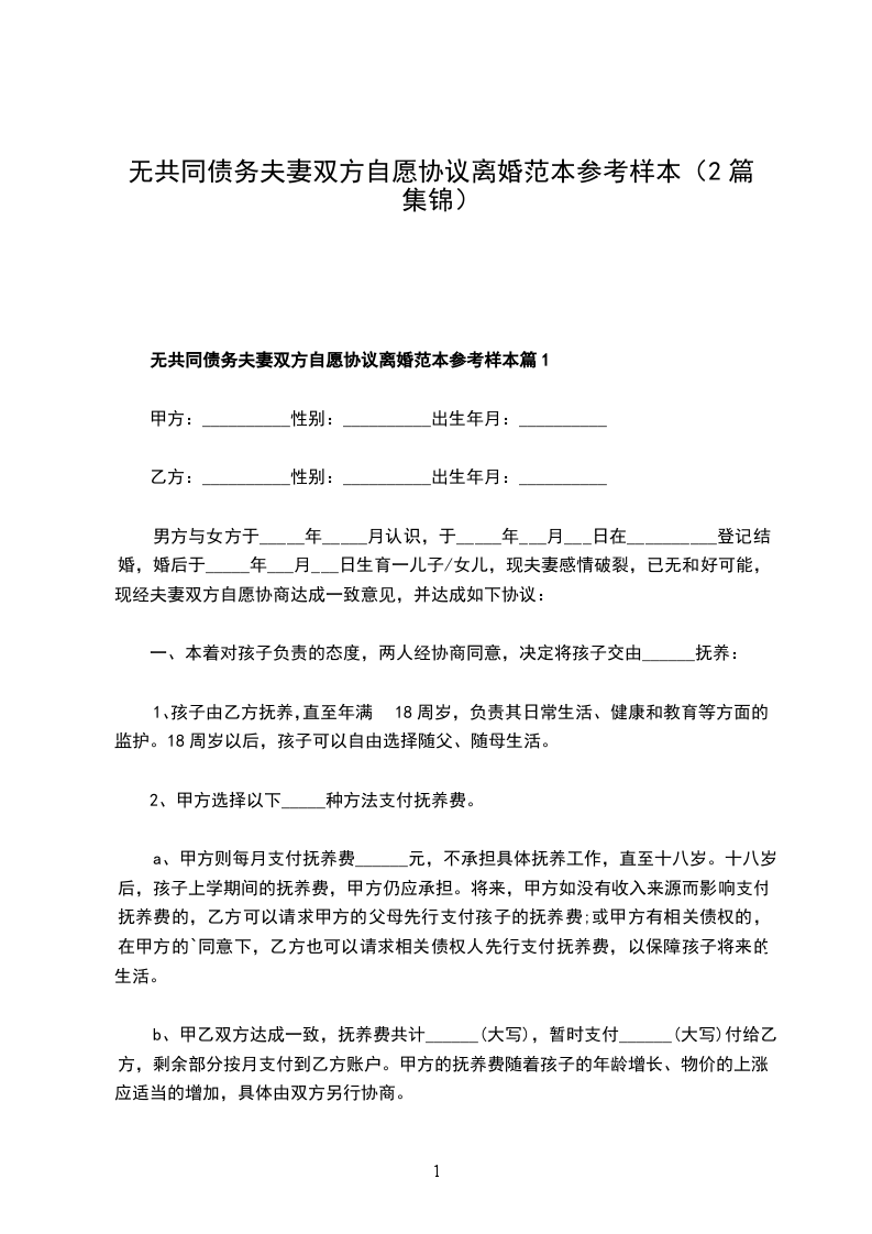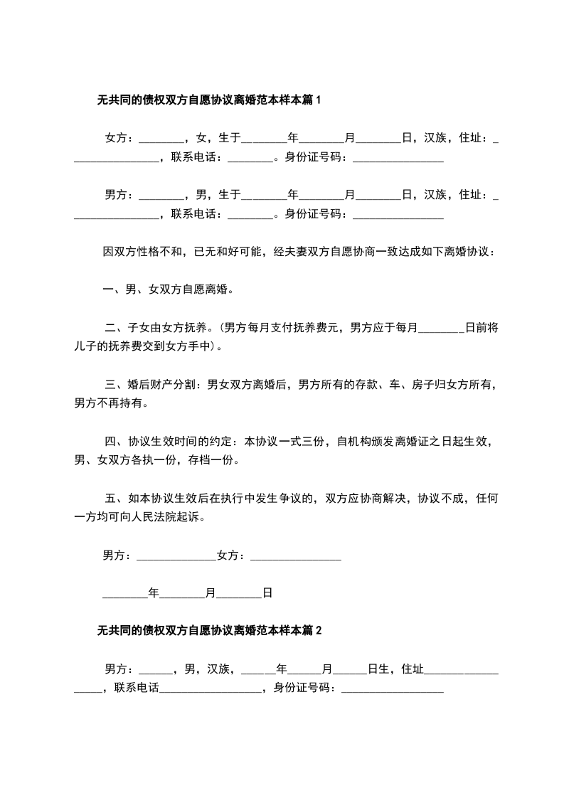 三、债权债务事项:男女双方婚姻存续期间无共同债权债务,任何一方隐瞒债务的,由负债方负责承担,另一方不承担任何责任,无债权债务纠纷。
