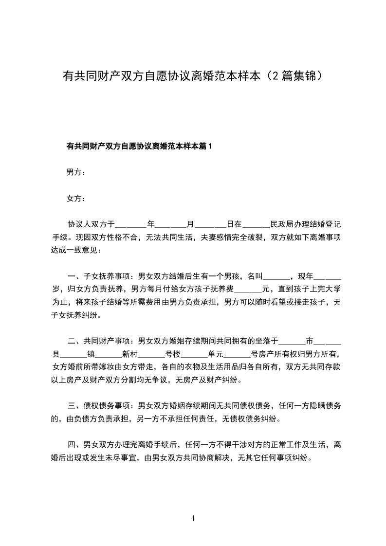 二、共同财产事项:男女双方婚姻存续期间共同拥有的坐落于_______市_______县_______镇_______新村_______号楼_______单元_______号房产所有权归男方所有,女方婚前所带嫁妆由女方带走,各自的衣物及生活用品归各自所有,双方无共同存款,以上房产及财产双方分割均无争议,无房产及财产纠纷。