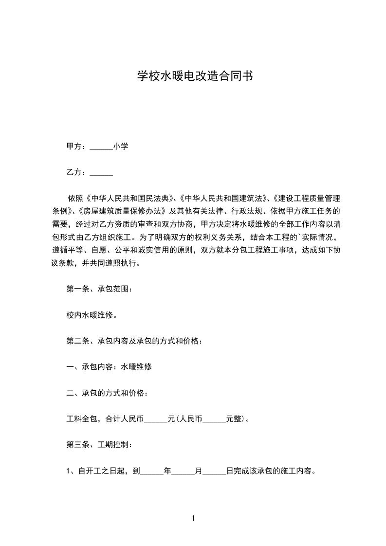 依照《中华人民共和国民法典》、《中华人民共和国建筑法》、《建设工程质量管理条例》、《房屋建筑质量保修办法》及其他有关法律、行政法规、依据甲方施工任务的需要,经过对乙方资质的审查和双方协商,甲方决定将水暖维修的全部工作内容以清包形式由乙方组织施工。为了明确双方的权利义务关系,结合本工程的`实际情况,遵循平等、自愿、公平和诚实信用的原则,双方就本分包工程施工事项,达成如下协议条款,并共同遵照执行。