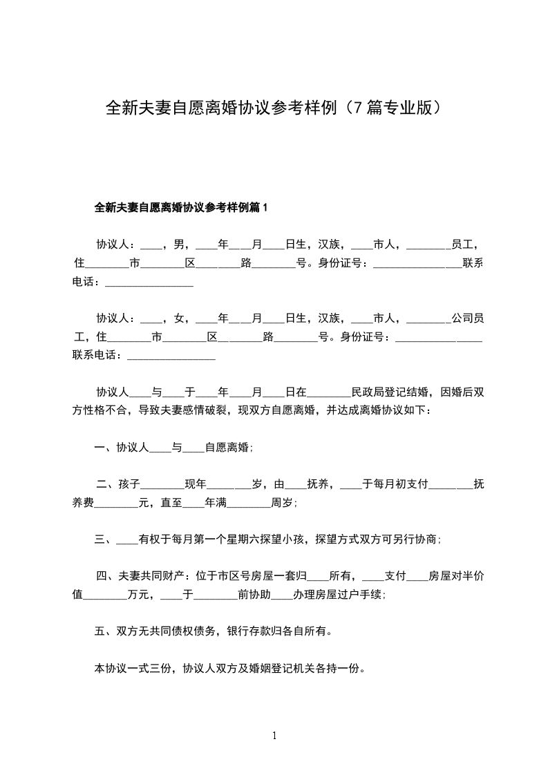全新夫妻自愿离婚协议参考样例篇1