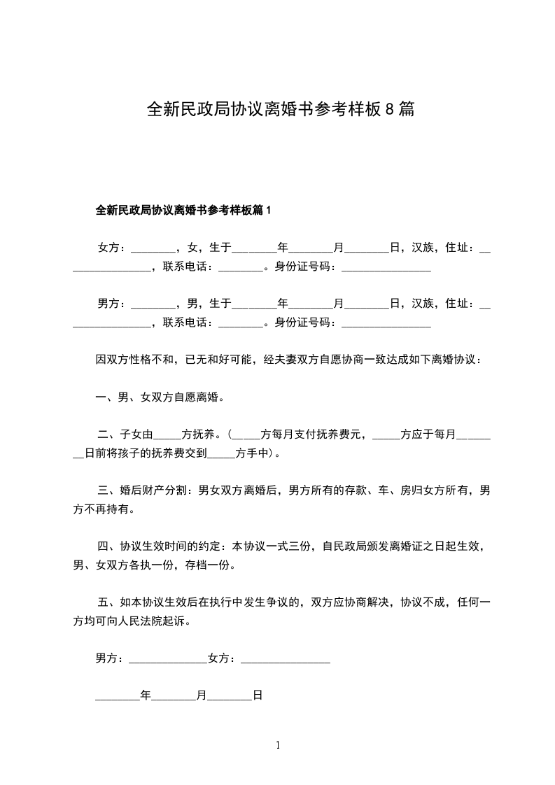 全新民政局协议离婚书参考样板篇8