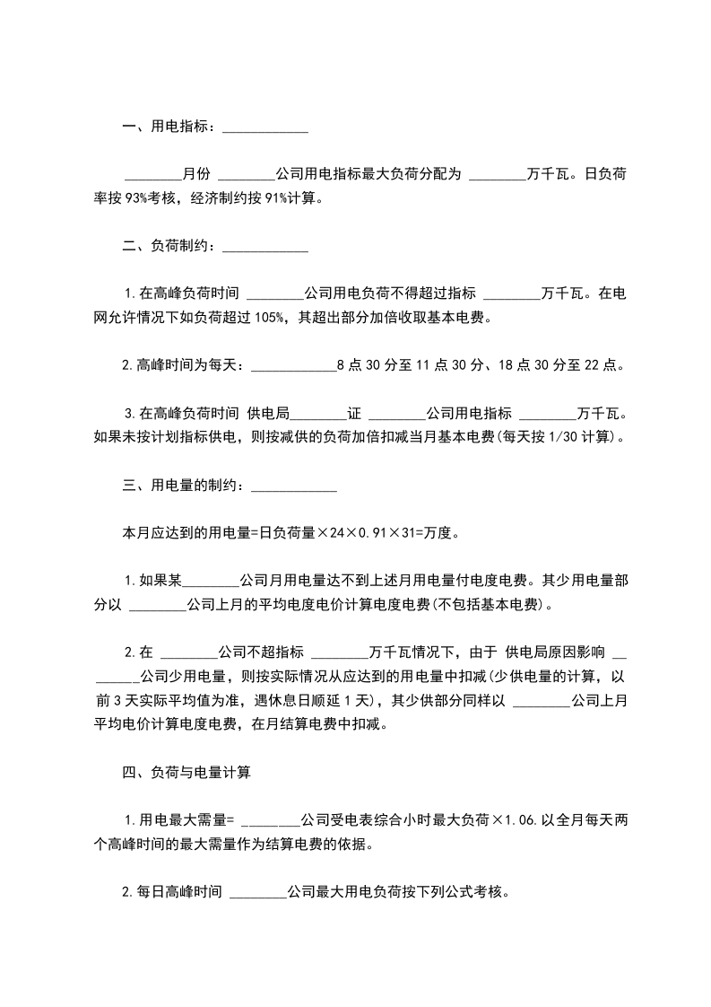 1.在高峰负荷时间 ________公司用电负荷不得超过指标 ________万千瓦。在电网允许情况下如负荷超过105%,其超出部分加倍收取基本电费。