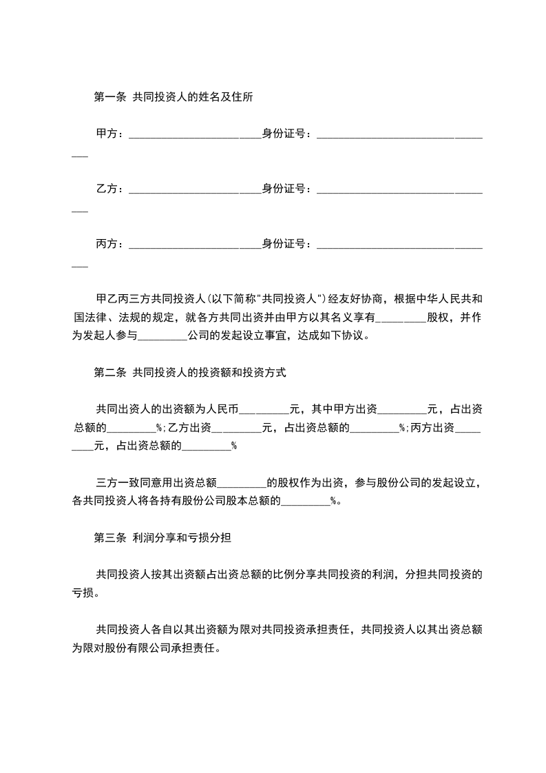 甲乙丙三方共同投资人(以下简称"共同投资人")经友好协商,根据中华人民共和国法律、法规的规定,就各方共同出资并由甲方以其名义享有_________股权,并作为发起人参与_________公司的发起设立事宜,达成如下协议。