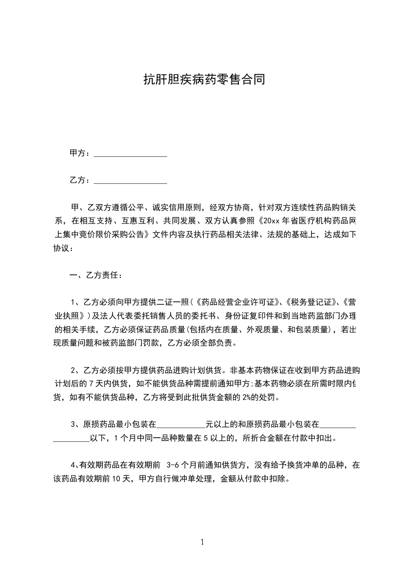 一、甲、乙双方本着真诚合作,诚信经营的原则,经协商达成药品购销合同书。双方承诺共同遵守。如因一方违反本合同书有关条款,给对方造成损失,违约方有责任赔偿对方损失。