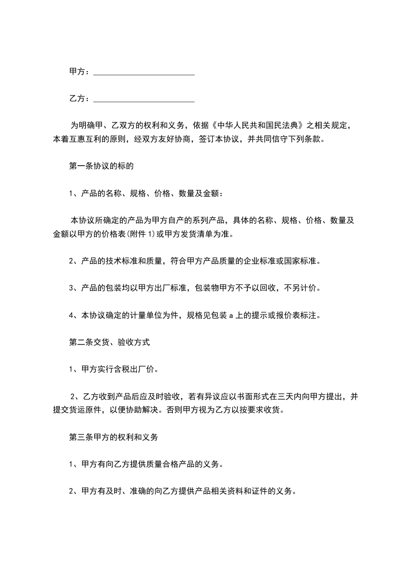 三、甲方向乙方提供书面购销、电话购销等购销方式。甲方在规定药品范围内供应的药品,其质量应保证符合国家法定标准和有关质量要求,提供的药品必须具有批准文号、注册商标、生产批号及有效期。药品的包装、标签、说明书应符合有关规定及要求。进口药品供加盖企业质管机构原印章的《进口药品注册证》和同批号《进口药品检验报告书》或通关单复印件。生物制品提供加盖企业质管机构原印章的《生物制品签发合格证书》复印件,甲方因违反上述条款,引起质量纠纷,甲方应承担相应经济和法律责任。