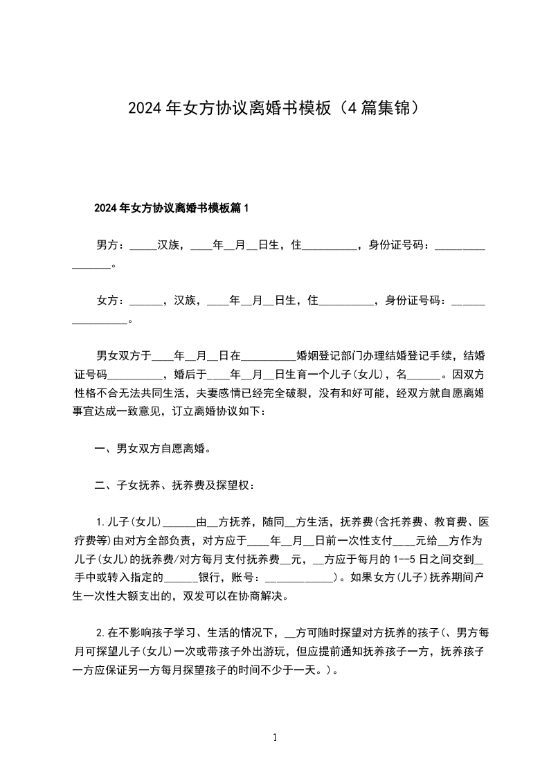 2024年女方协议离婚范本怎么写篇1