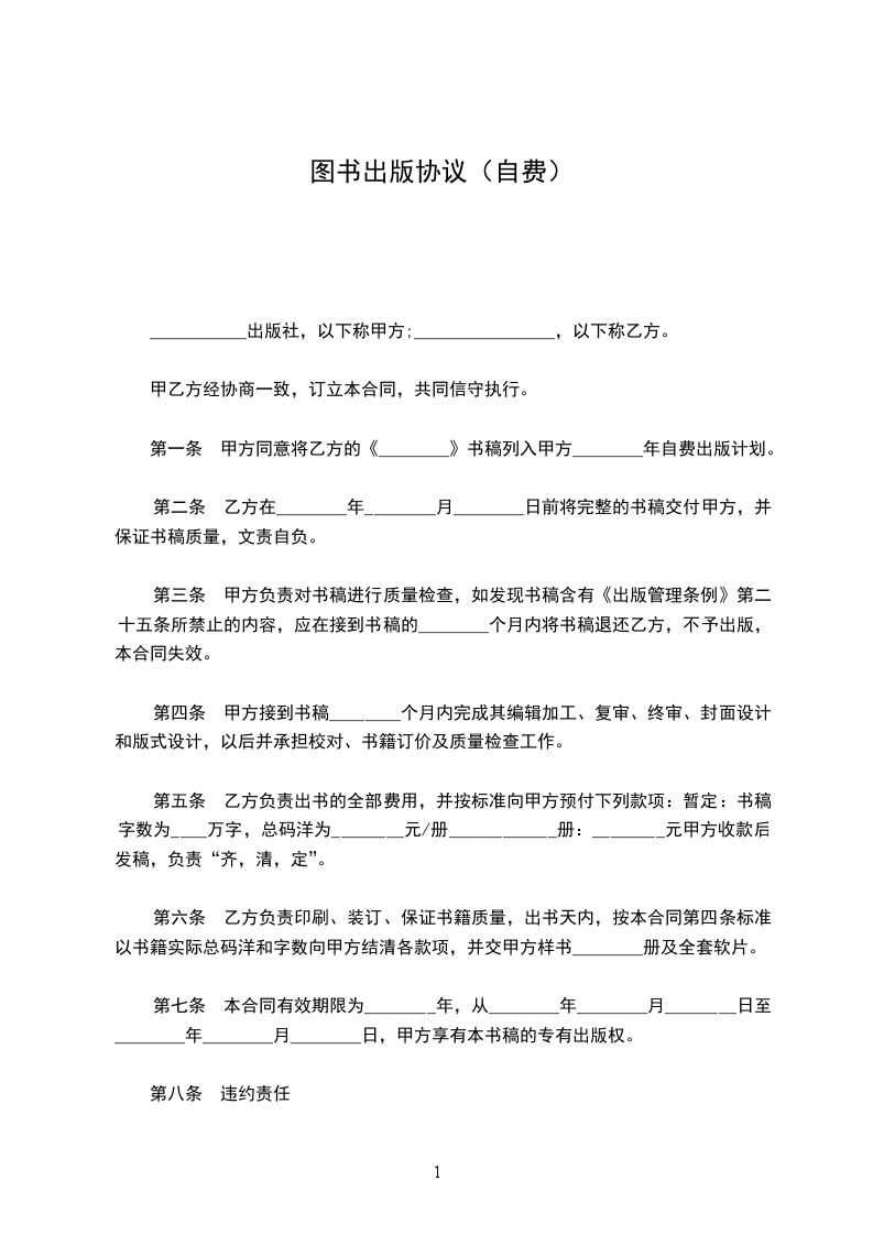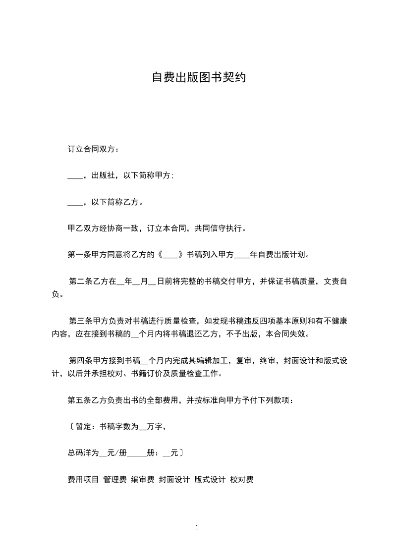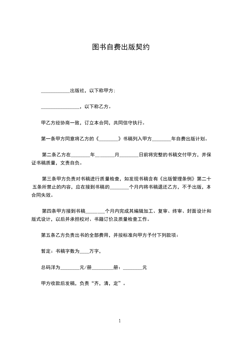 第一条 甲方同意将乙方的《___________》书稿列入甲方 _______年自费出版计划。