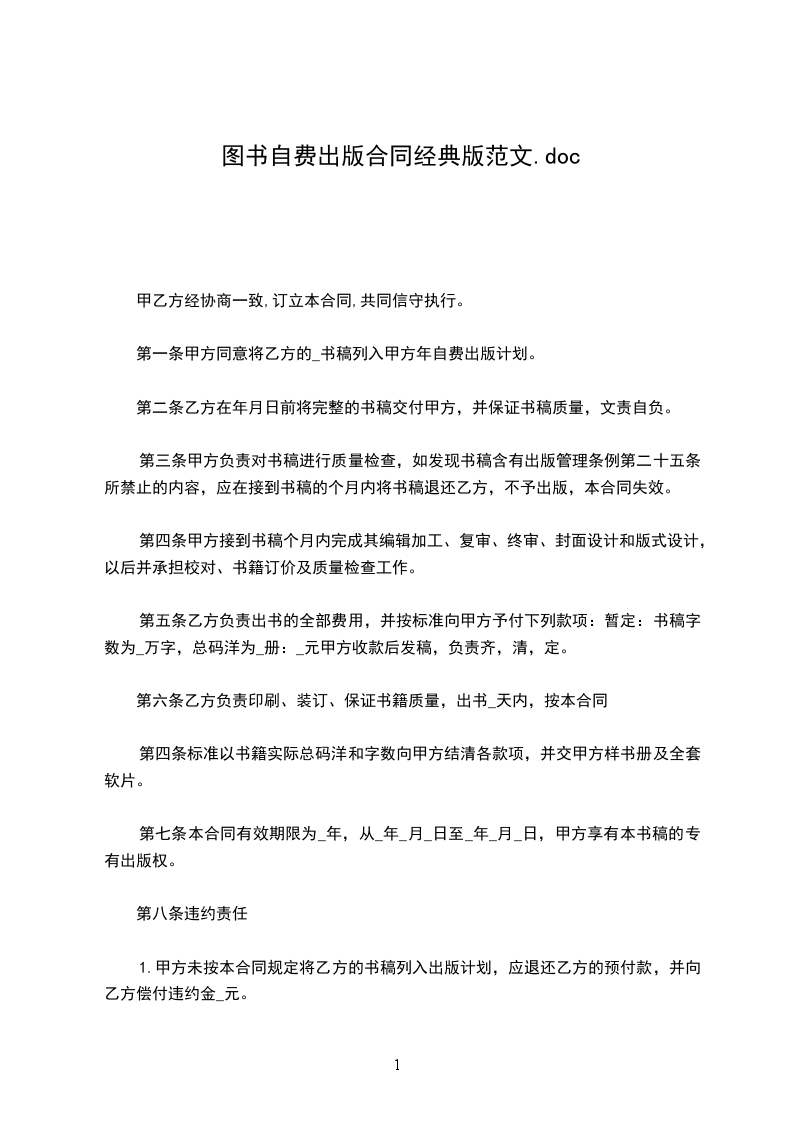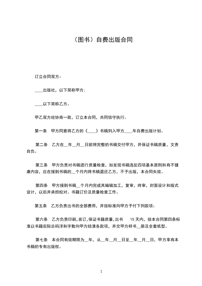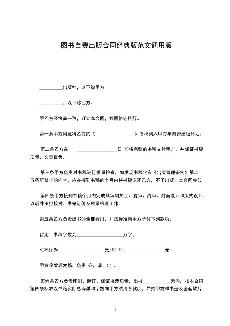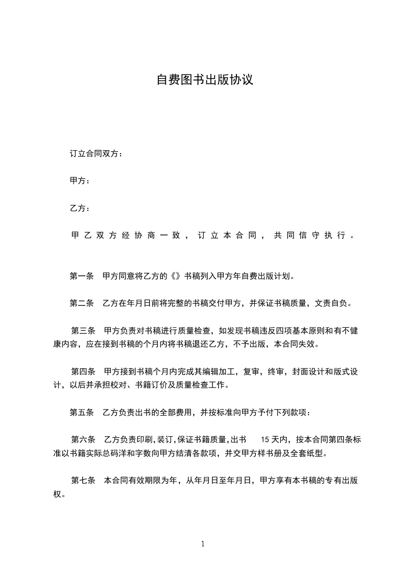 第一条 甲方同意将乙方的《___________》书稿列入甲方 _______年自费出版计划。