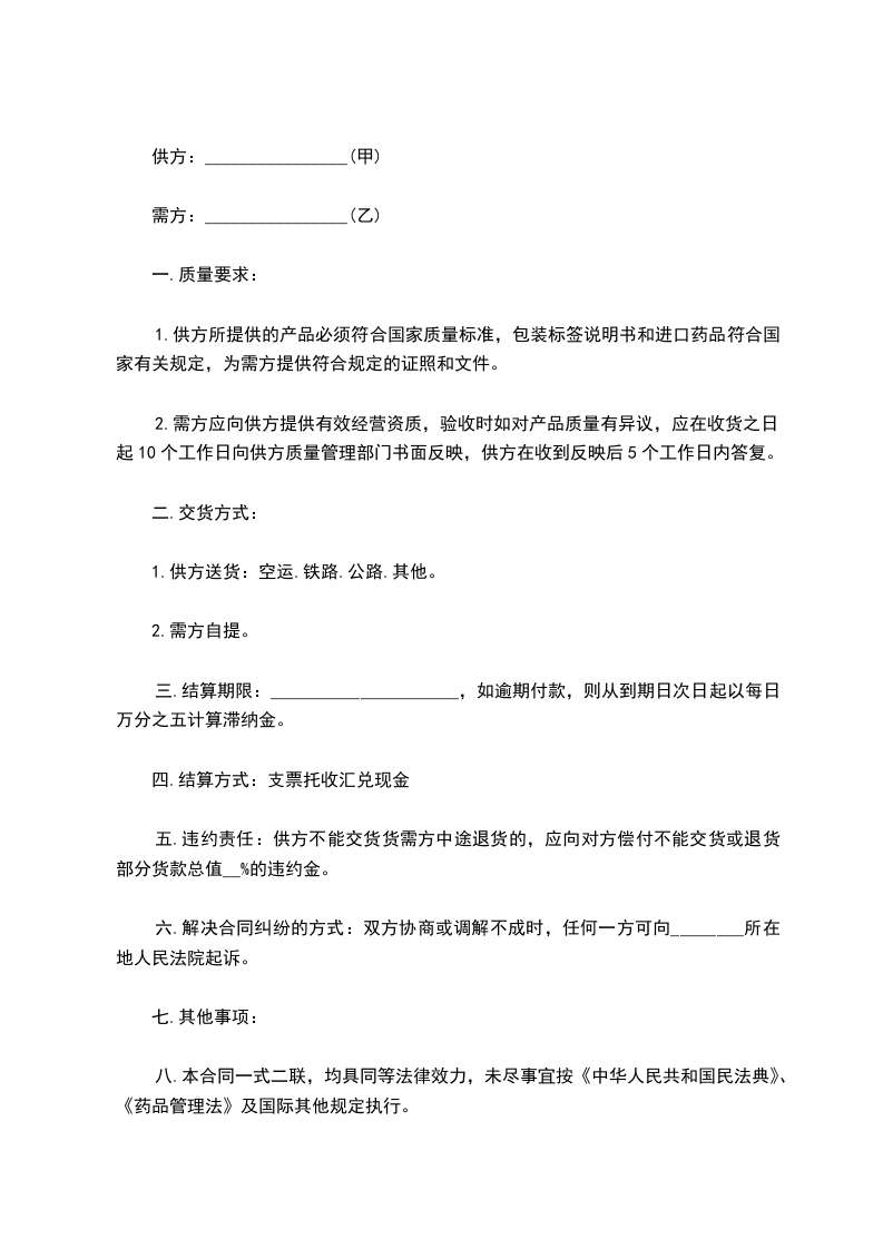 八.本合同一式二联,均具同等法律效力,未尽事宜按《中华人民共和国民法典》、《药品管理法》及国际其他规定执行。