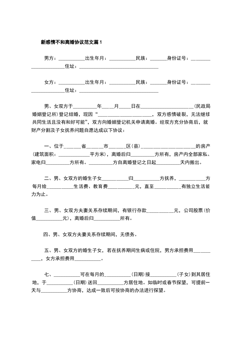 男方______与女方______于______年______月认识,于______年______月______日在______市民政局登记结婚,婚后于______年______月______日生育一儿子,名______。两人因性格不合,致使夫妻感情破裂,已无和好可能,现经夫妻双方自愿协商达成一致意见,订立离婚协议如下: