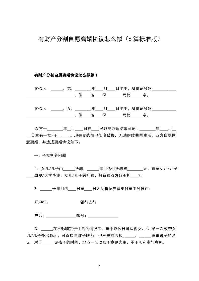 (1)夫妻婚后共有房屋坐落在__________________住房一套。现协商该套房产归______方所有,______方同意在办理完离婚手续后配合______方办理产权变更手续。