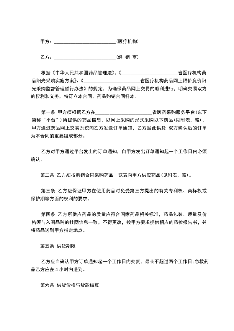 第一条 甲方须根据乙方在________________________省医药采购服务平台(以下简称“平台”)所提供的药品信息,以网上采购的形式采购以下药品(见附表,略),甲方通过药品网上交易系统向乙方发送订单通知,乙方据此供货;双方确认后的订单为本合同的重要组成部分。