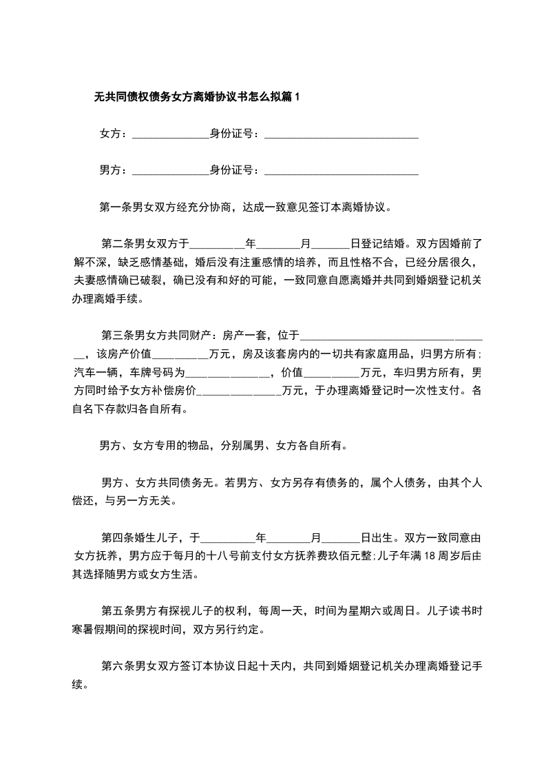 男方、女方共同债务无。若男方、女方另存有债务的,属个人债务,由其个人偿还,与另一方无关。