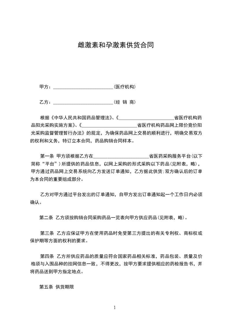 第一条 甲方须根据乙方在________________________省医药采购服务平台(以下简称“平台”)所提供的药品信息,以网上采购的形式采购以下药品(见附表,略),甲方通过药品网上交易系统向乙方发送订单通知,乙方据此供货;双方确认后的订单为本合同的重要组成部分。