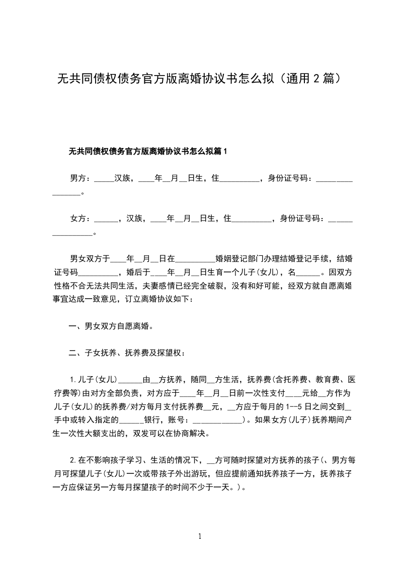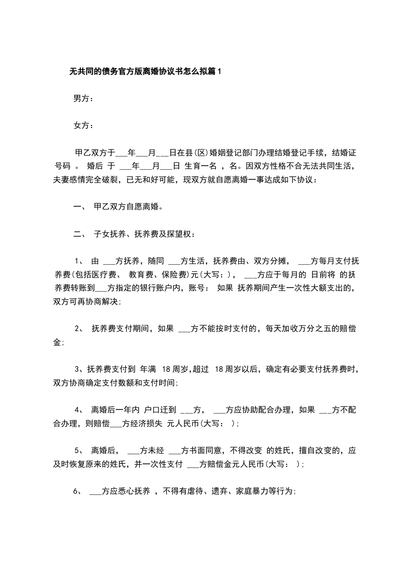 男方__与女方__于____年__月认识,于____年__月__日在__市民政局登记结婚,婚后于____年__月__日生育一儿子,名___。两人因性格不合,致使夫妻感情破裂,已无和好可能,现经夫妻双方自愿协商达成一致意见,订立离婚协议如下:
