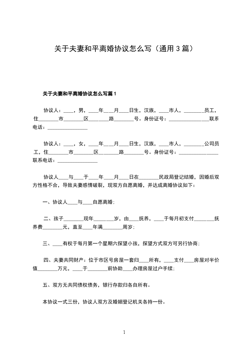 2、本协议一式三份,男女双方各执一份,婚姻登记机关存档一份。