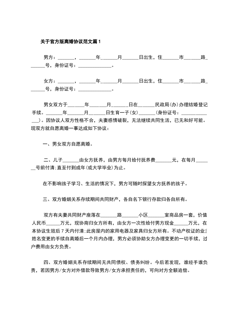 关于官方版离婚协议范文篇1