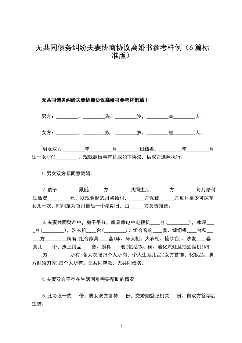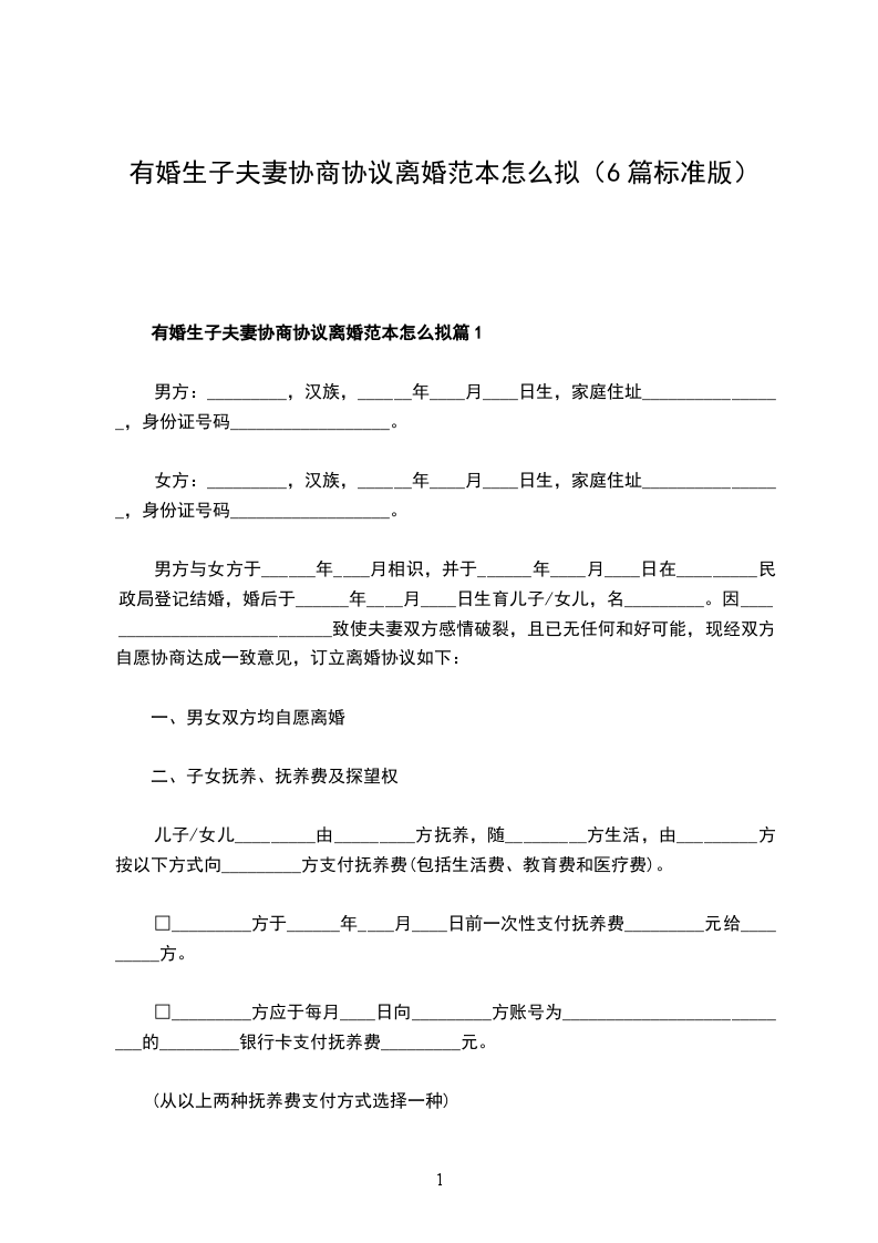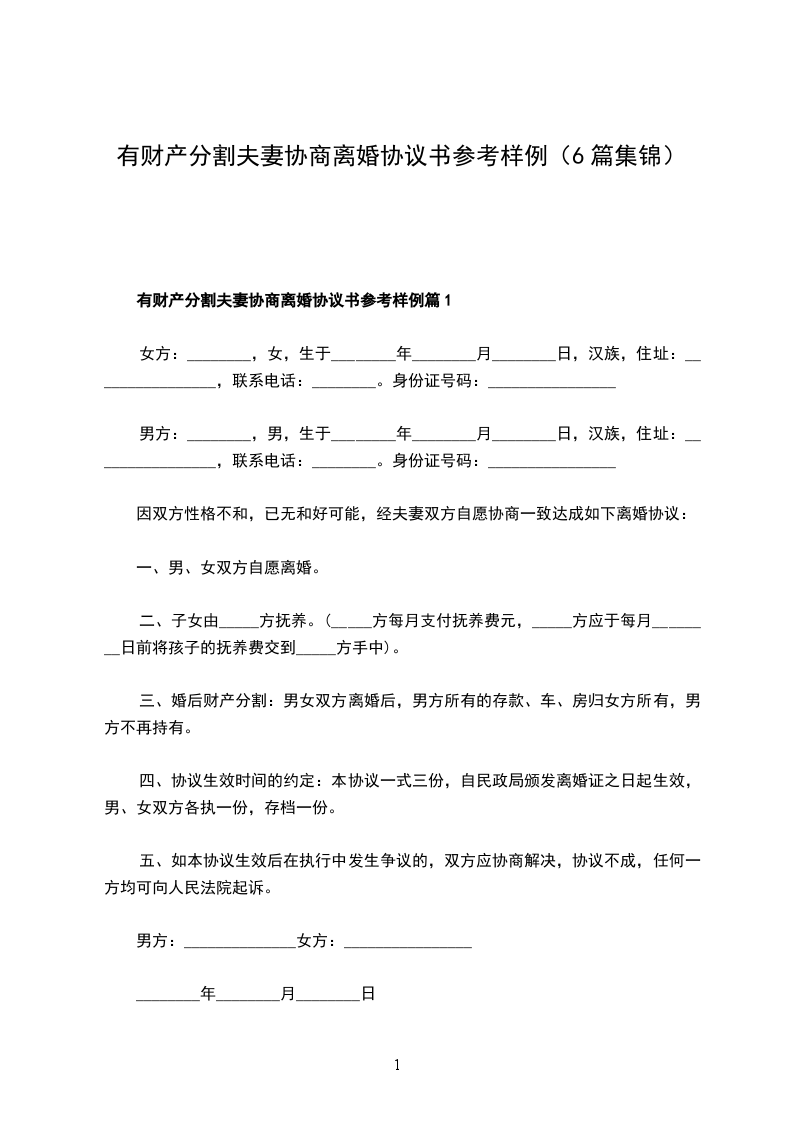 双方于________年________月________日在________________人民政府的民政部门登记结婚,婚后一个子女,因双方性格不和,无法共同生活,自愿离婚,经双方协商一致,订立离婚协议如下: