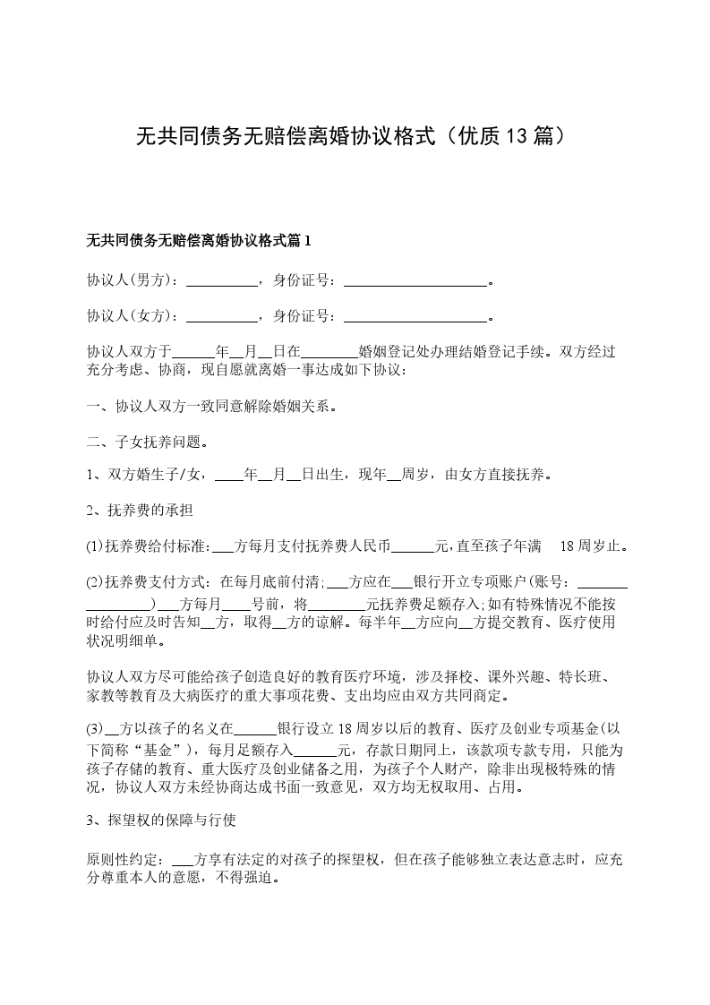 八、本协议一式三份,男、女双方各执一份,婚姻登记机关存档一份。