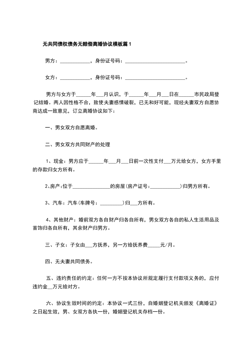 三、债权债务事项:男女双方婚姻存续期间无共同债权债务,任何一方隐瞒债务的,由负债方负责承担,另一方不承担任何责任,无债权债务纠纷。