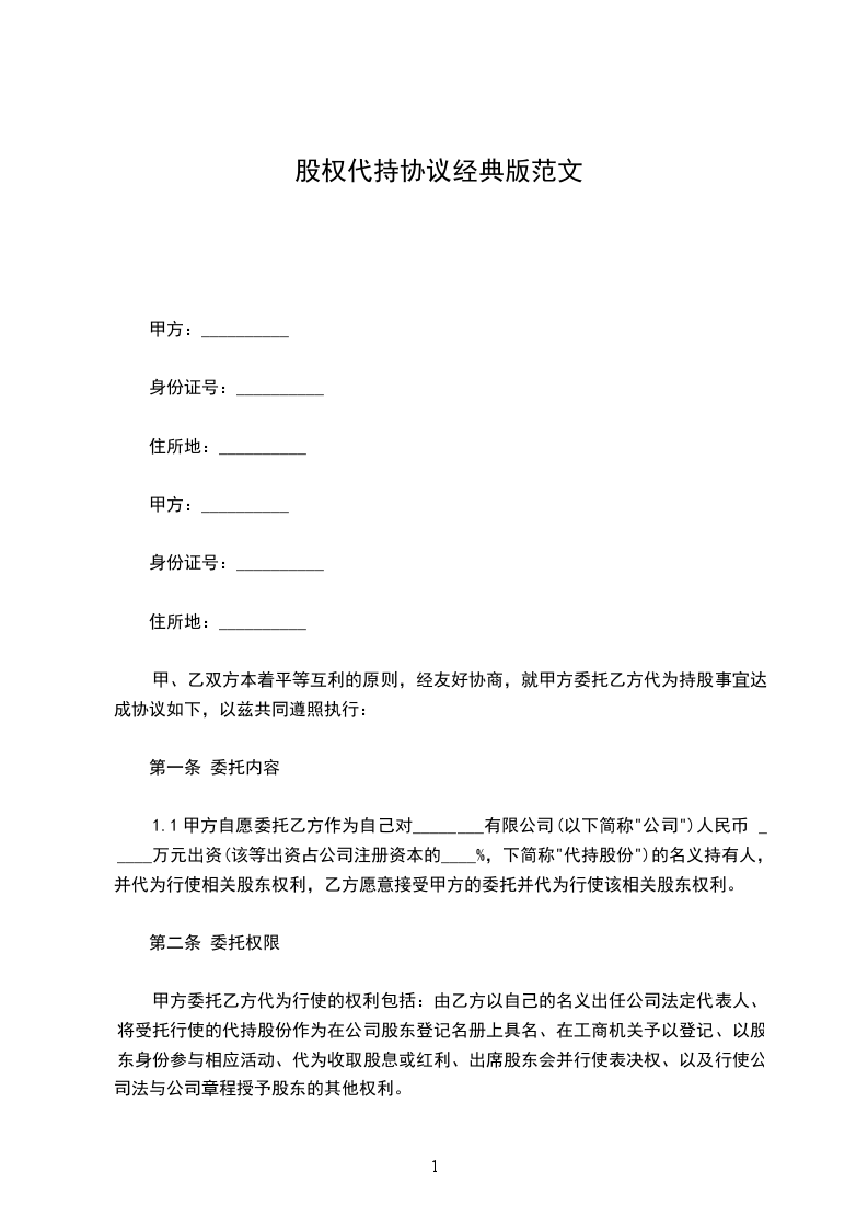 甲、乙双方本着平等互利的原则,经友好协商,就甲方委托乙方代为持股事宜达成协议如下,以兹共同遵照执行:
