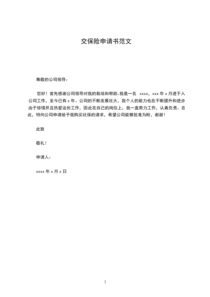 您好!首先感谢公司领导对我的栽培和帮助。我是一名xxxx,xxx年x月进于入公司工作,至今已有x年。公司的不断发展壮大,我个人的能力也在不断提升和进步。由于珍惜并且热爱这份工作,因此在自己的岗位上,我一直努力工作,认真负责。在此,特向公司申请给予我购买社保的请求,希望公司能够批准为盼,谢谢!