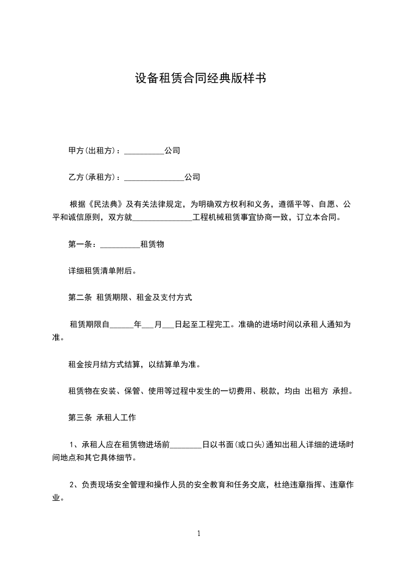 根据《民法典》及有关法律规定,为明确双方权利和义务,遵循平等、自愿、公平和诚信原则,双方就_______________工程机械租赁事宜协商一致,订立本合同。