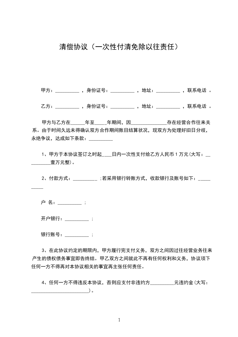 1、甲方于本协议签订之时起____日内一次性支付给乙方人民币1万元(大写:__________壹万元整)。
