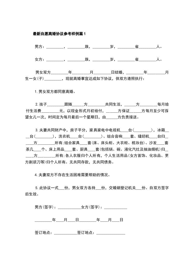 最新自愿离婚协议参考样例篇5