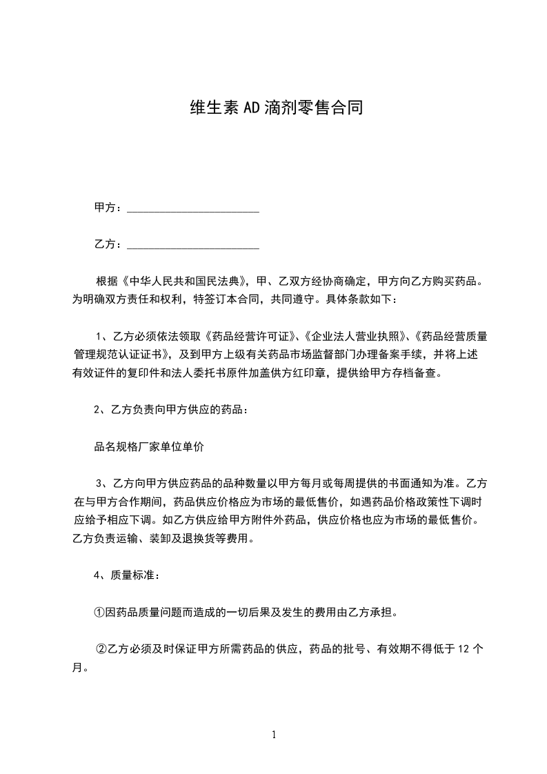维生素D零售合同