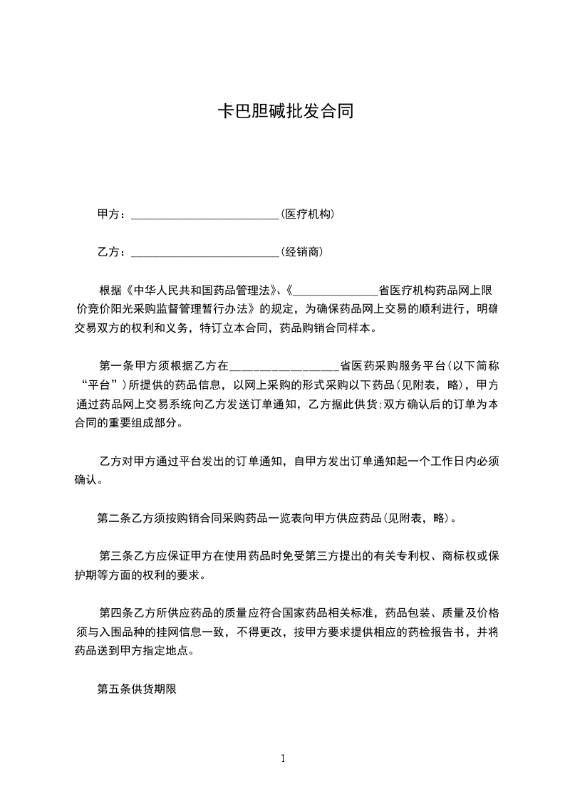 第一条甲方须根据乙方在__________________省医药采购服务平台(以下简称“平台”)所提供的药品信息,以网上采购的形式采购以下药品(见附表,略),甲方通过药品网上交易系统向乙方发送订单通知,乙方据此供货;双方确认后的订单为本合同的重要组成部分。