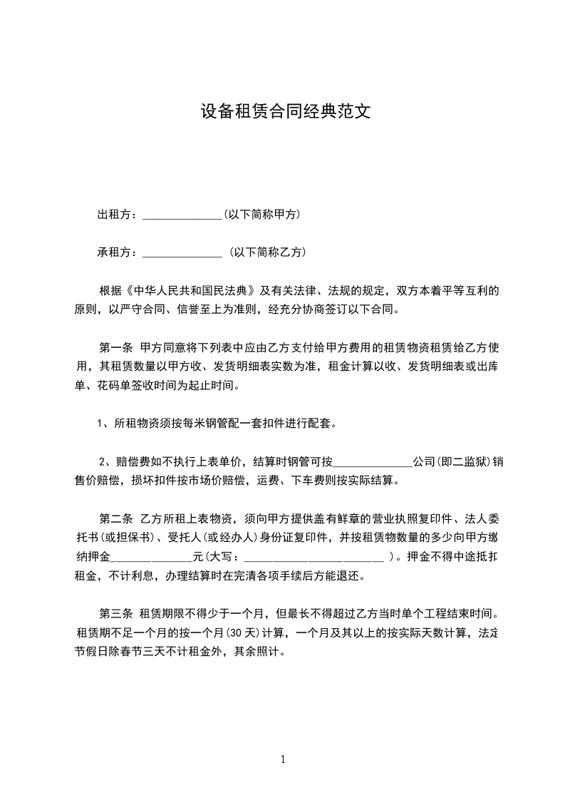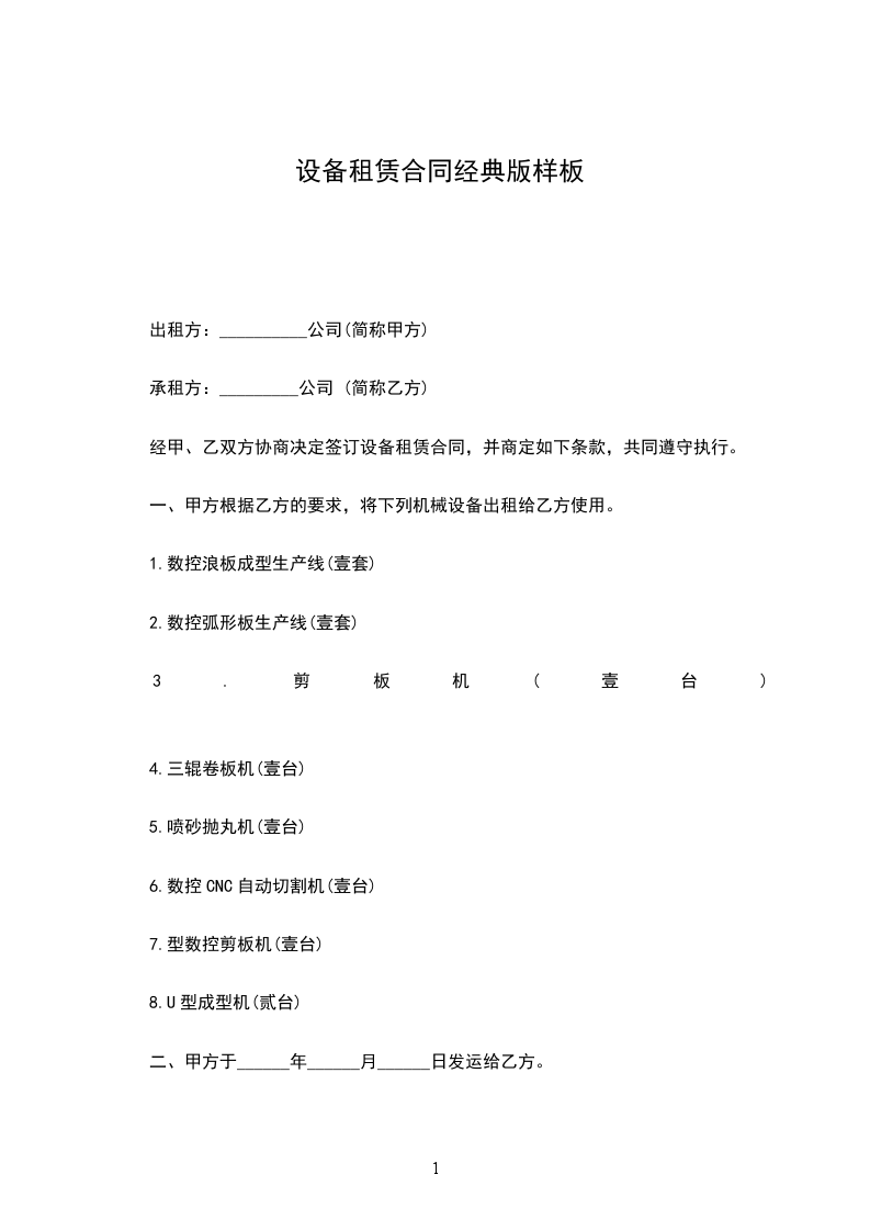 五、设备租赁期限为 _________年,租期甲方向乙方发运之日算起,租金总额为人民币______元,分______期交付,每期租赁金__________元,由甲方在每期期末按期向乙方收取。如乙方不能按期承付租金,甲方则按逾期租金总额每天加收万分之三的罚金。