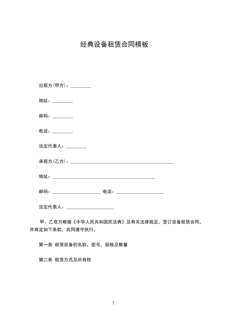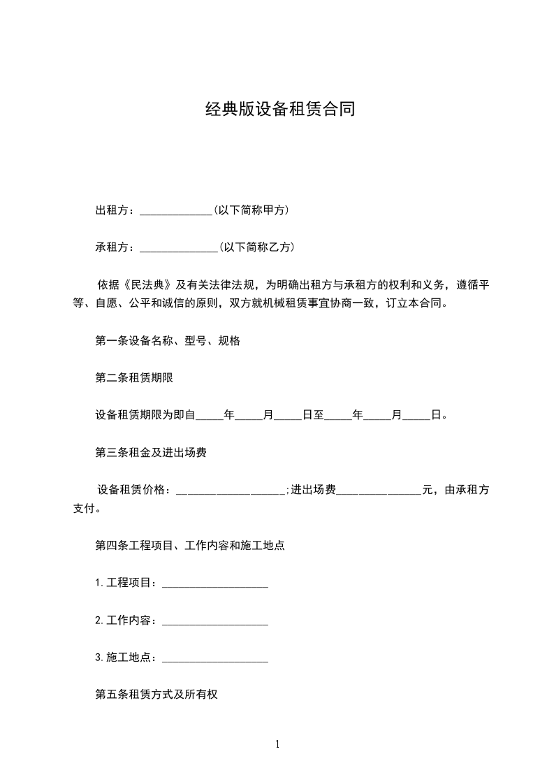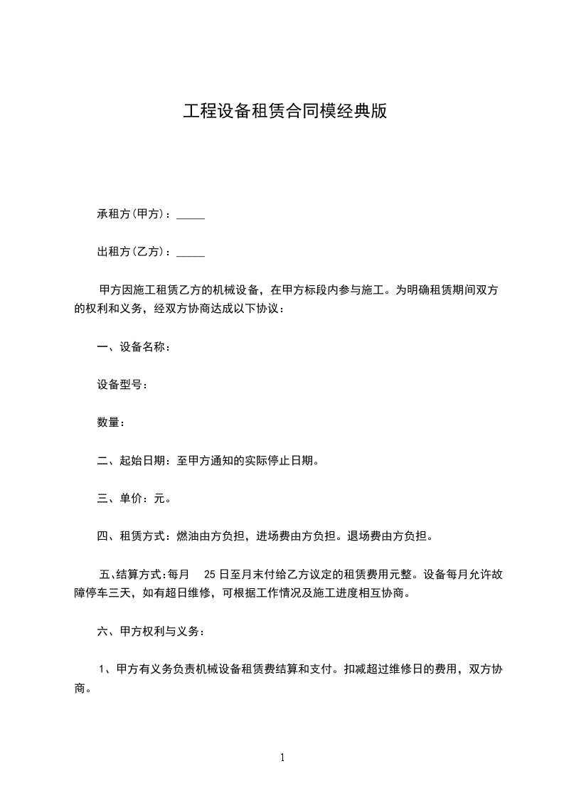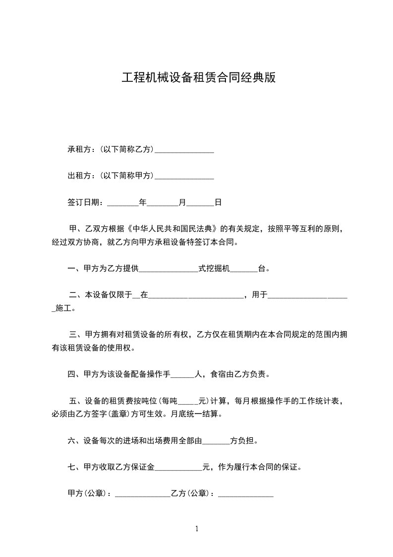 根据《中华人民共和国民法典》的规定,为维护双方的合法权益,经甲、乙双方当事人协商一致,就工程机械设备租赁达成以下协议:
