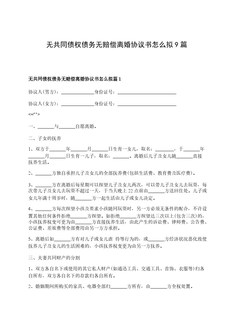 无共同债权债务无赔偿离婚协议书怎么拟篇9