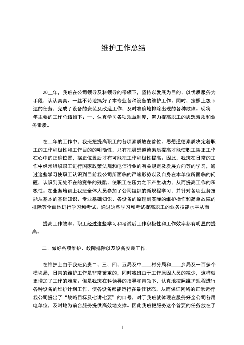 20__年,我班在公司领导及科领导的带领下,坚持以发展为目的、以优质服务为手段,认认真真、一丝不苟地搞好了本专业各种设备的维护工作。同时,按照上级下达的任务,完成了设备的安装及改造工作,及时准确地排除出现的各种故障。现将__年主要的工作总结如下:一、认真学习各项规章制度,努力提高职工的思想素质和业务素质。
