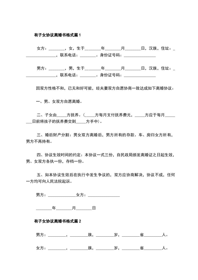 本《离婚协议书》一式叁份,甲、乙双方,婚姻登记机关各持一份,具有同等法律效力,自婚姻登记机关颁发《离婚证》之日起生效。