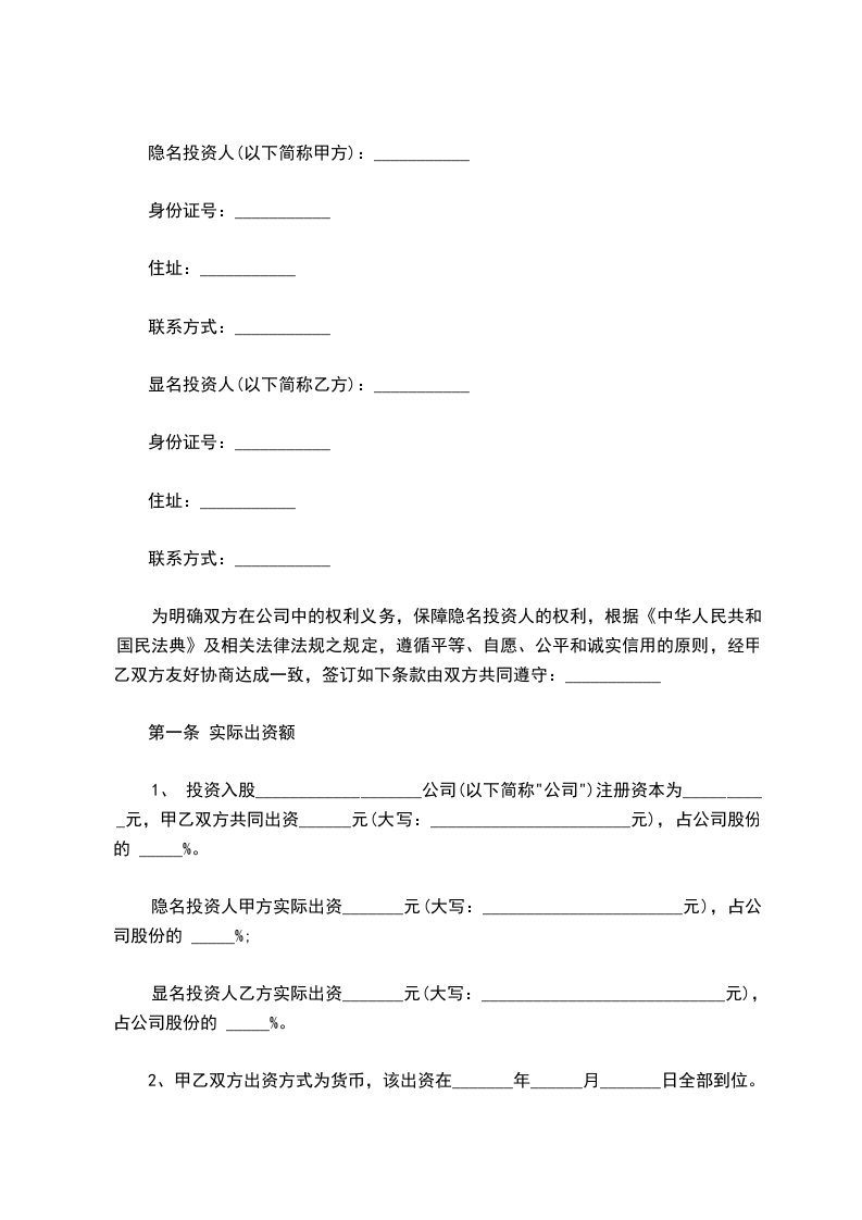 为明确双方在公司中的权利义务,保障隐名投资人的权利,根据《中华人民共和国民法典》及相关法律法规之规定,遵循平等、自愿、公平和诚实信用的原则,经甲乙双方友好协商达成一致,签订如下条款由双方共同遵守:___________