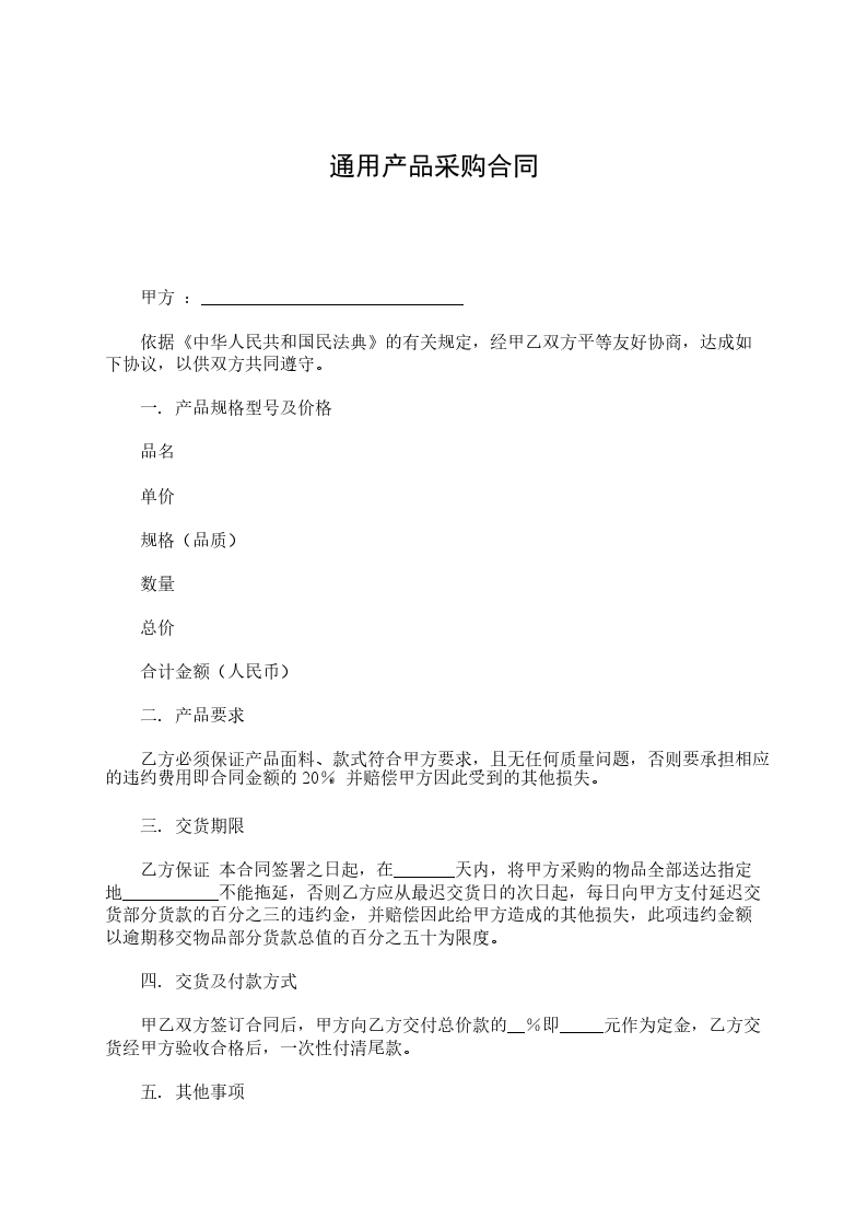四.交货及付款方式甲乙双方签订合同后,甲方向乙方交付总价款的__%即元作为定金,乙方交货经甲方验收合格后,一次性付清尾款。